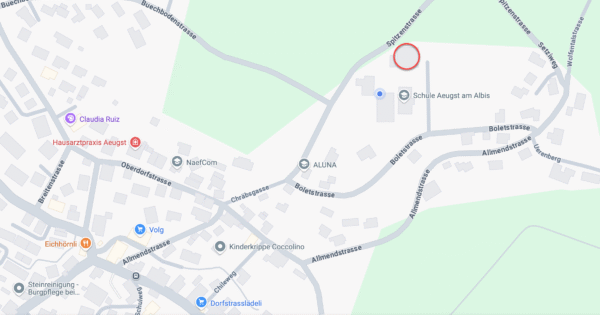 Anreise | ![]() Bus-Haltestelle Aeugst am Albis, Dorf Wenige öffentliche Parkplätze vor dem Schulhaus, Anfahrt Allmendstrasse/Boletstrasse. Am besten zu Fuss oder mit ÖV anreisen. |